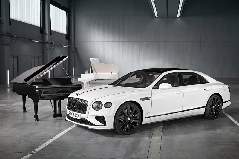 Zur Markteinführung präsentierte Bentley einen Flying Spur Speed in Arctic White mit Interieur in Piano Black – eine Farbkombination, die die Dualität der neuen Steinway-Editionen widerspiegelt.